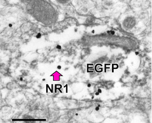 Ultrastructural analysis of the mouse hypothalamic paraventricular nucleus shows that NR1-silver-intensified immunogold (black dots) density is decreased in estrogen receptor β-enhanced green fluorescent protein (EGFP)-containing dendrites in young females, and increased in males and aged females.